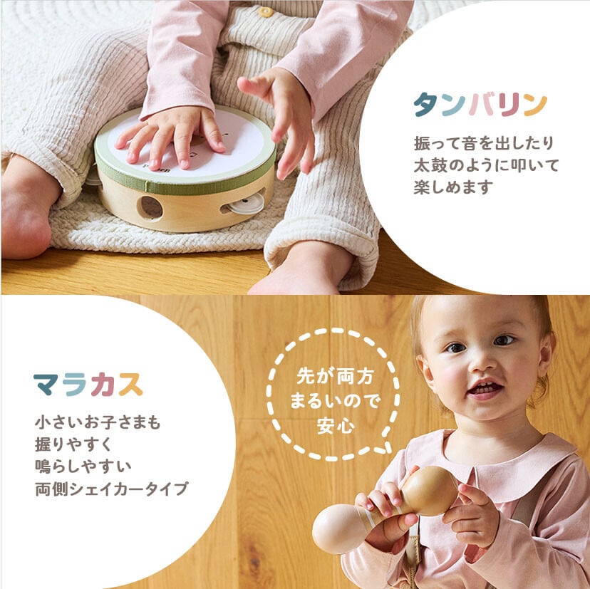 *素材:タンバリン:合板、ポリエステル、ポリプロピレン、鉄 マラカス:木