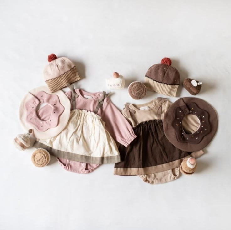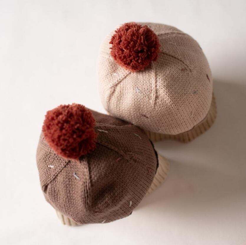 カラースプレーを振りかけた、美味しそうなカップケーキデザインのニット帽です。