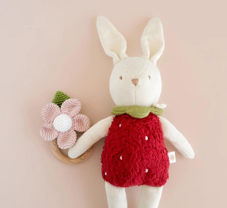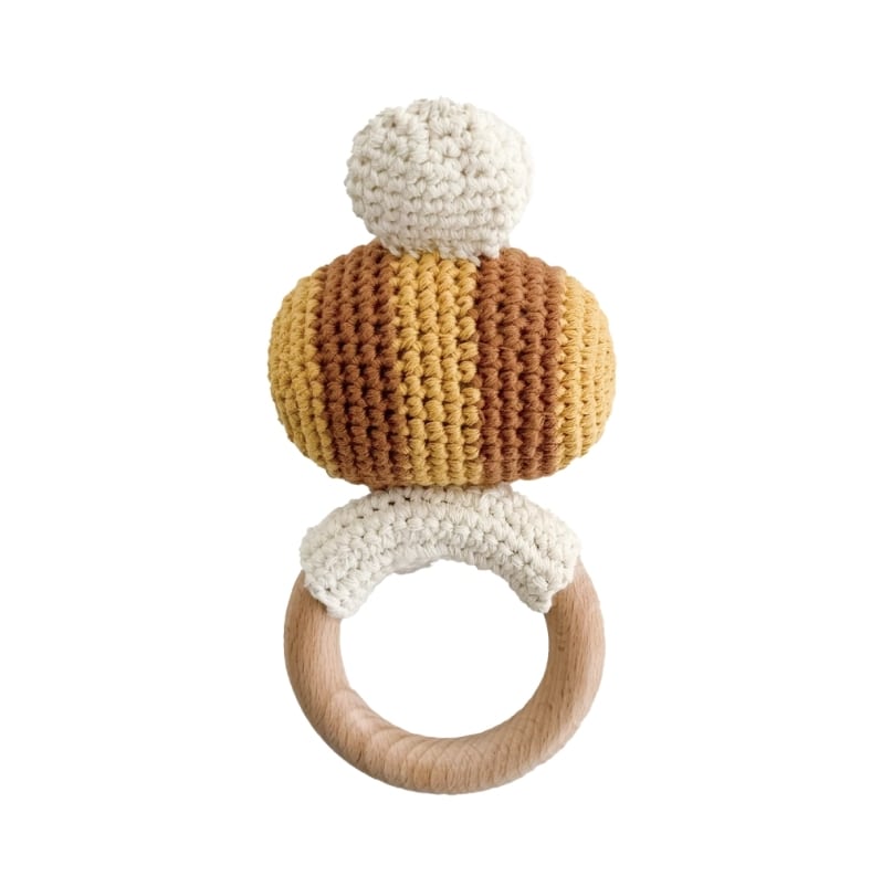 あみぐるみと木のリングのコラボレーションがナチュラルでおしゃれなラトルトイ。