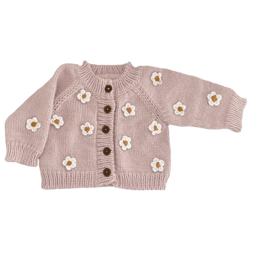 ニット帽と同じ手編みのアクリル100%の糸を使用した柔らかいカーディガン。
