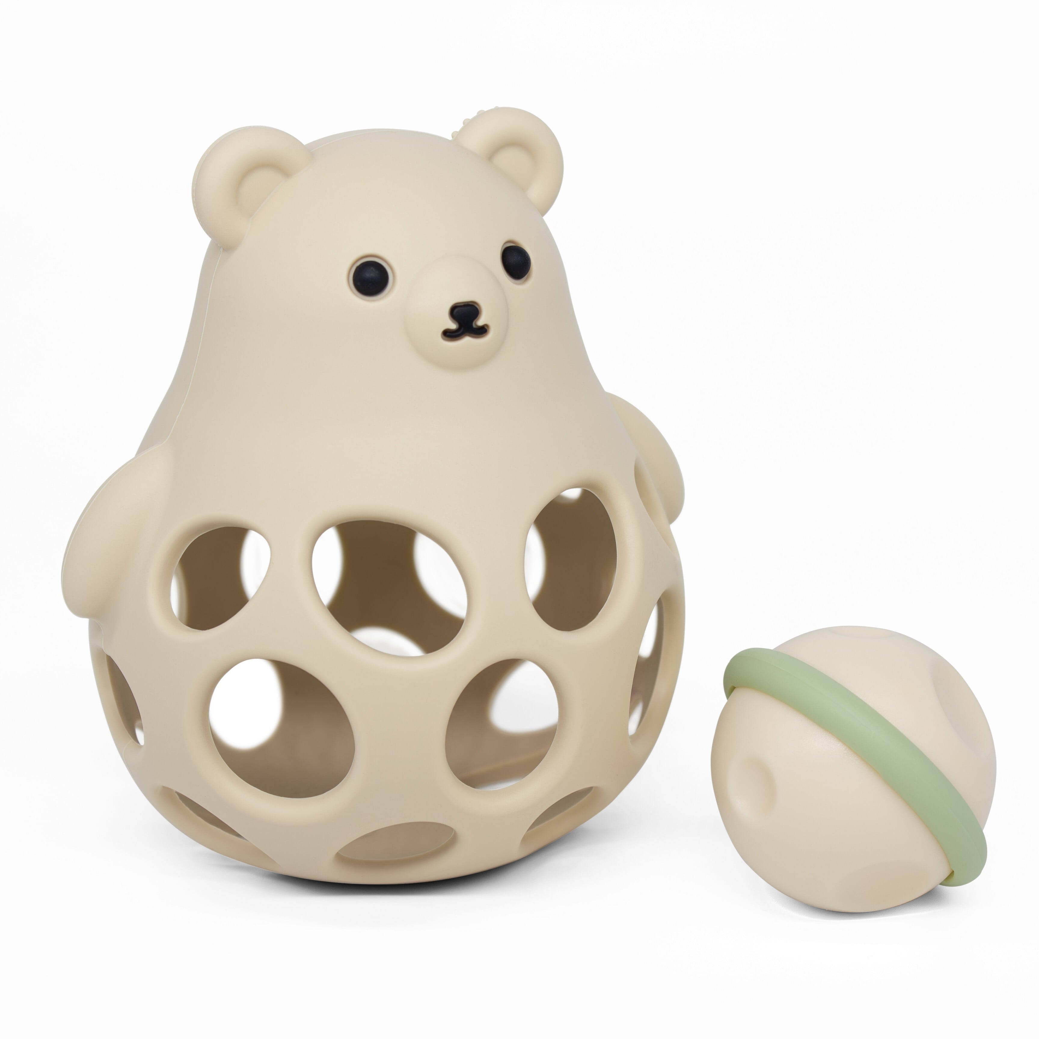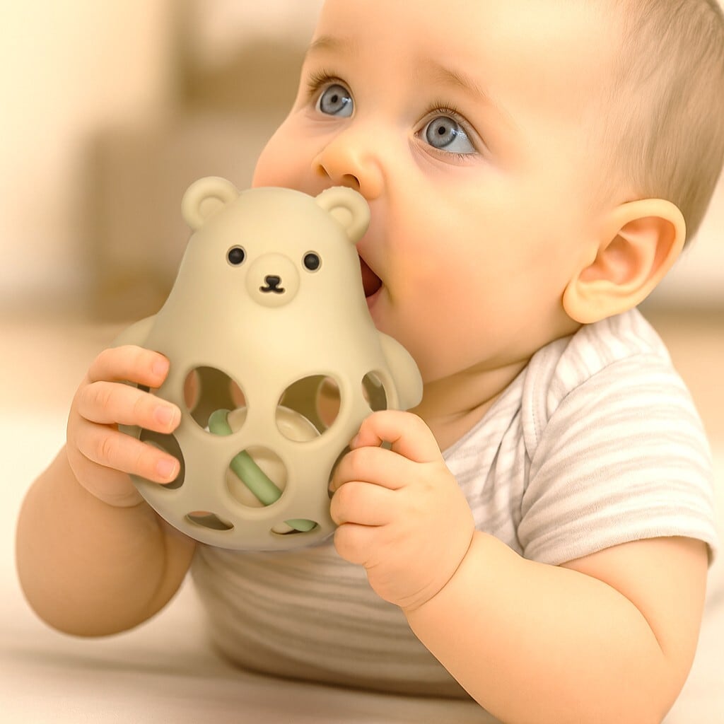 ベビーの小さな手でもしっかり握れる、くま型の穴あきデザイン。指の発達にも◎