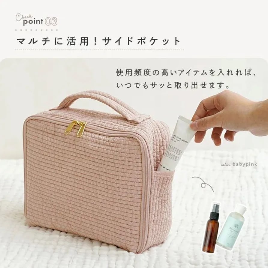 おむつも着替えも入る大容量サイズで、小物や ケア用品 を入れておくのに便利な サイドポケット付き。