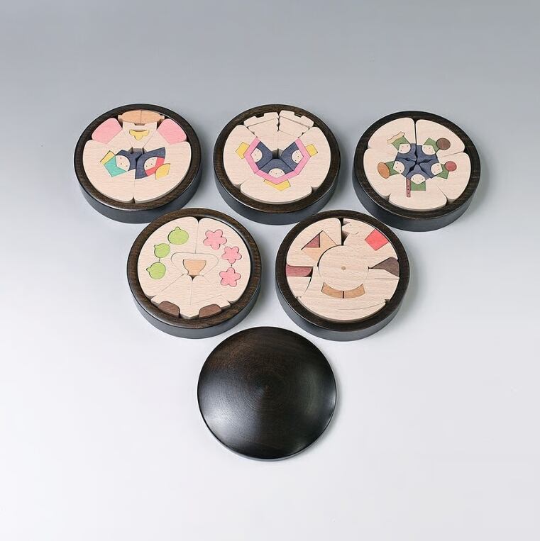 全部で95片の木片を各段ごとに5つの円形容器に収めることができます。