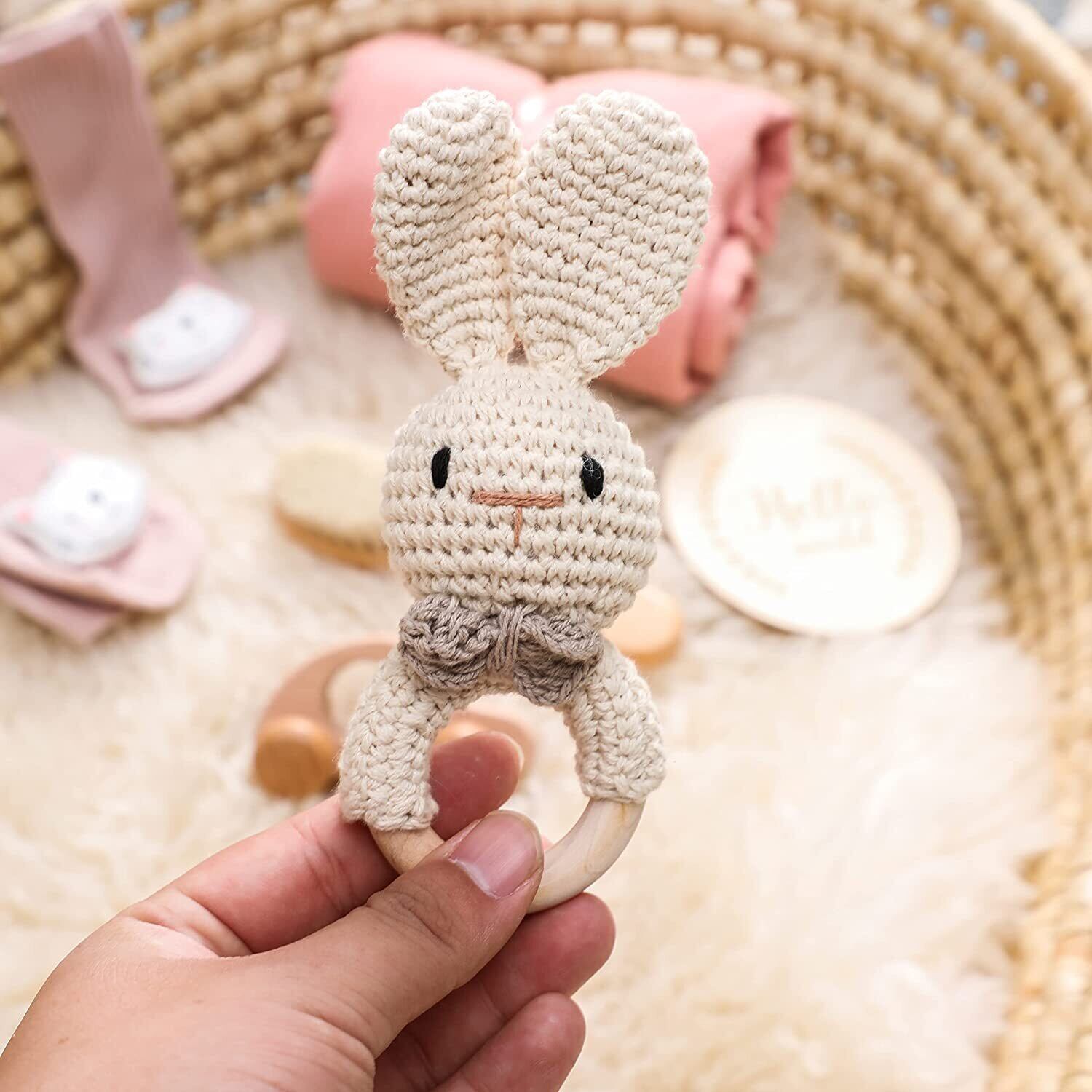 かわいいアニマルあみぐるみのラトルや木のおもちゃ、