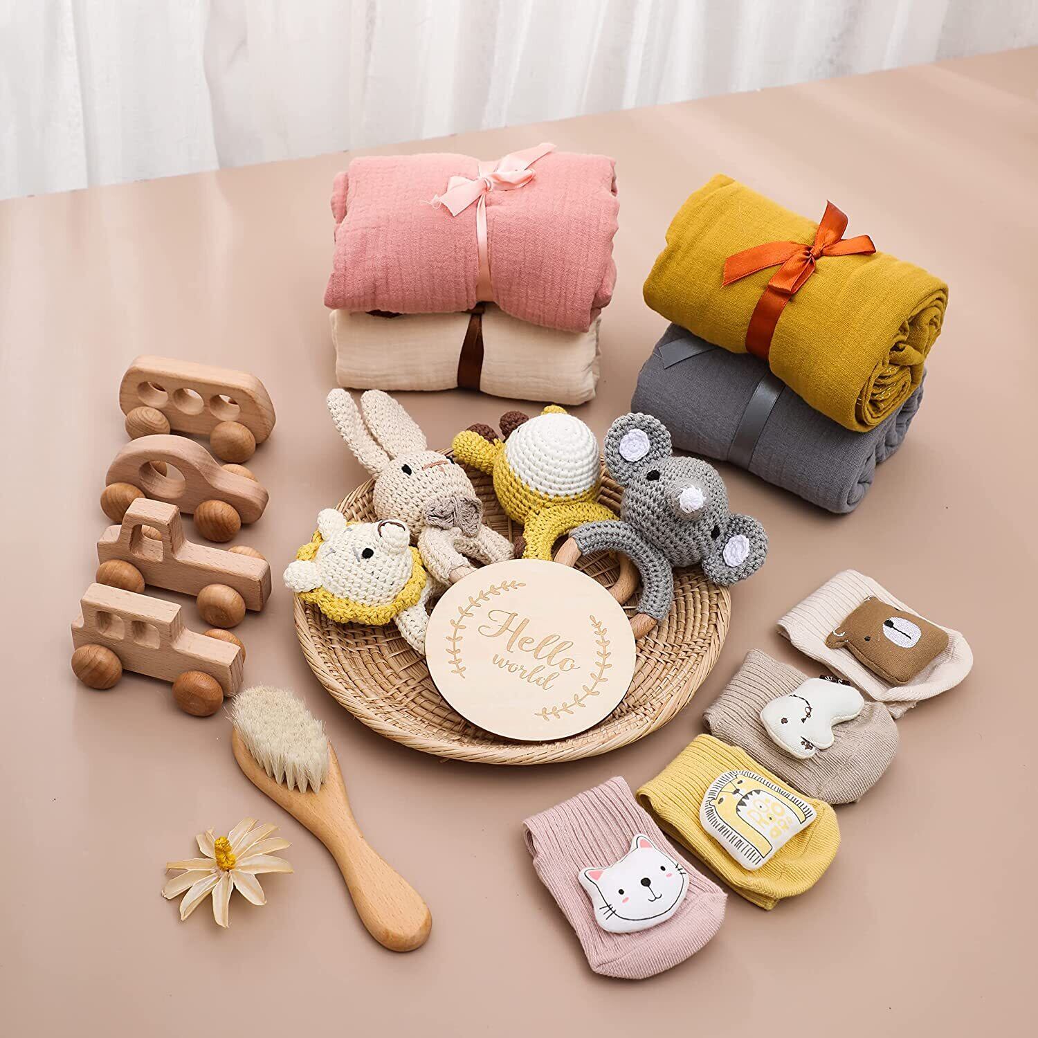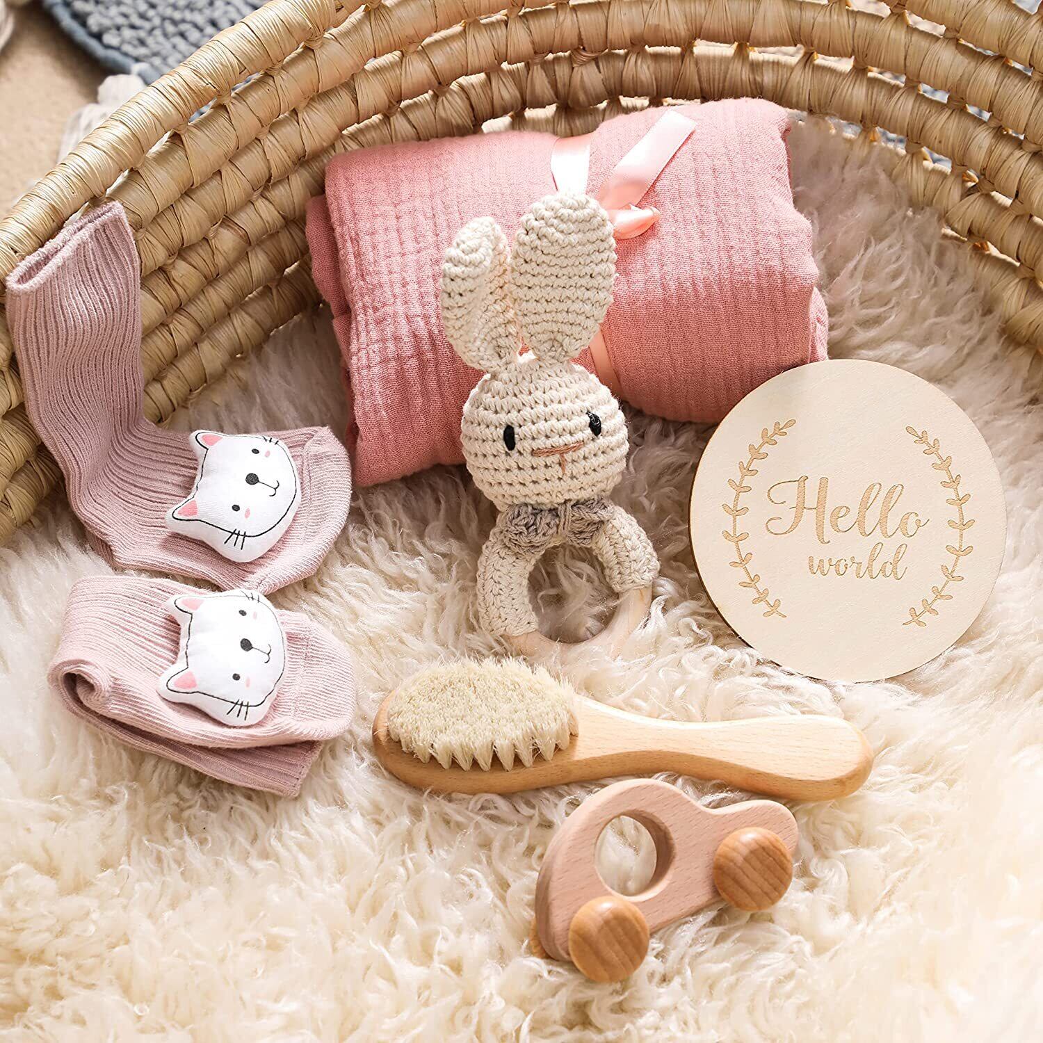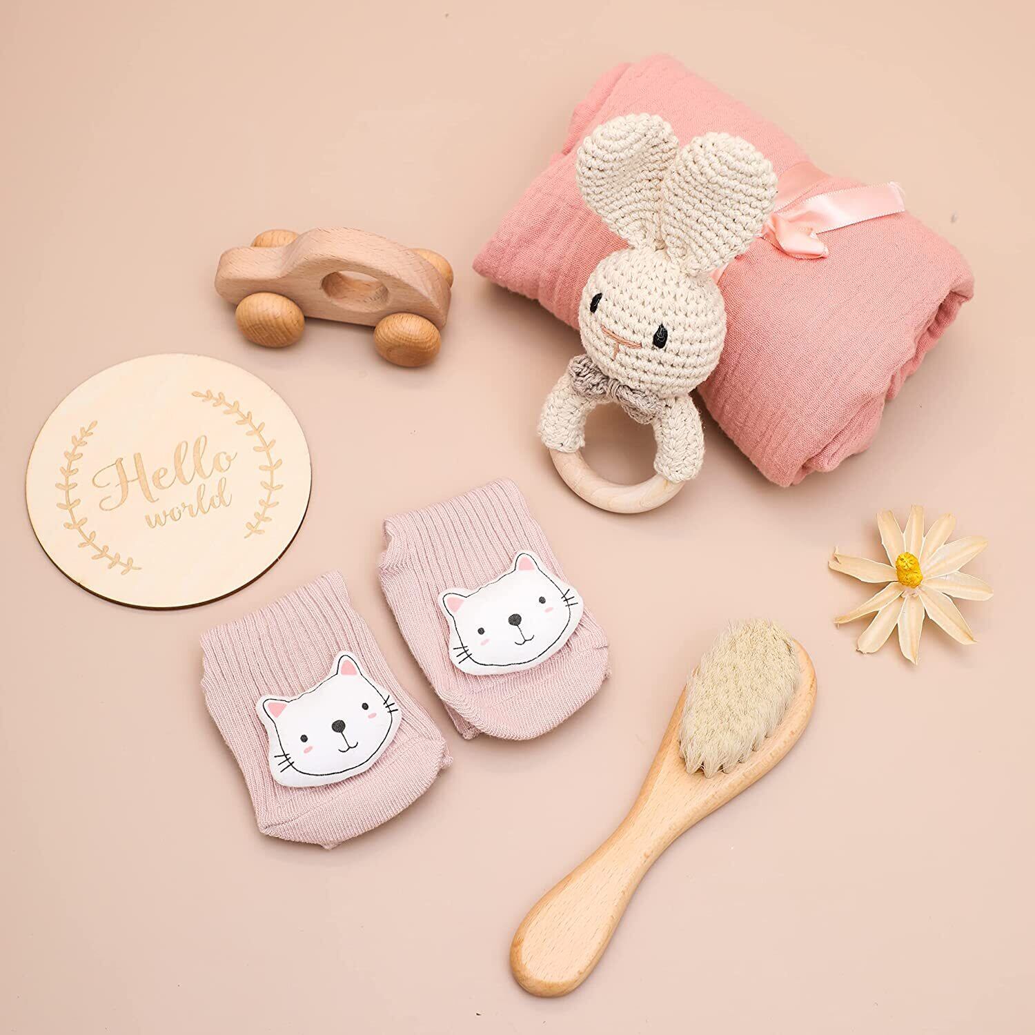 *セット内容:ガーゼブランケット、アニマルラトル、ブラシ、木製カード、木のくるま、ソックス