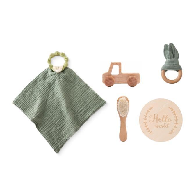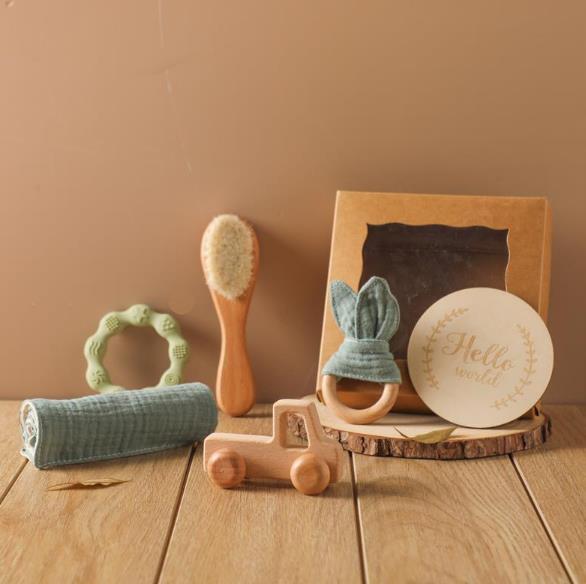 ガーゼ、ベビーブラシ、木製カードの6点セットです。