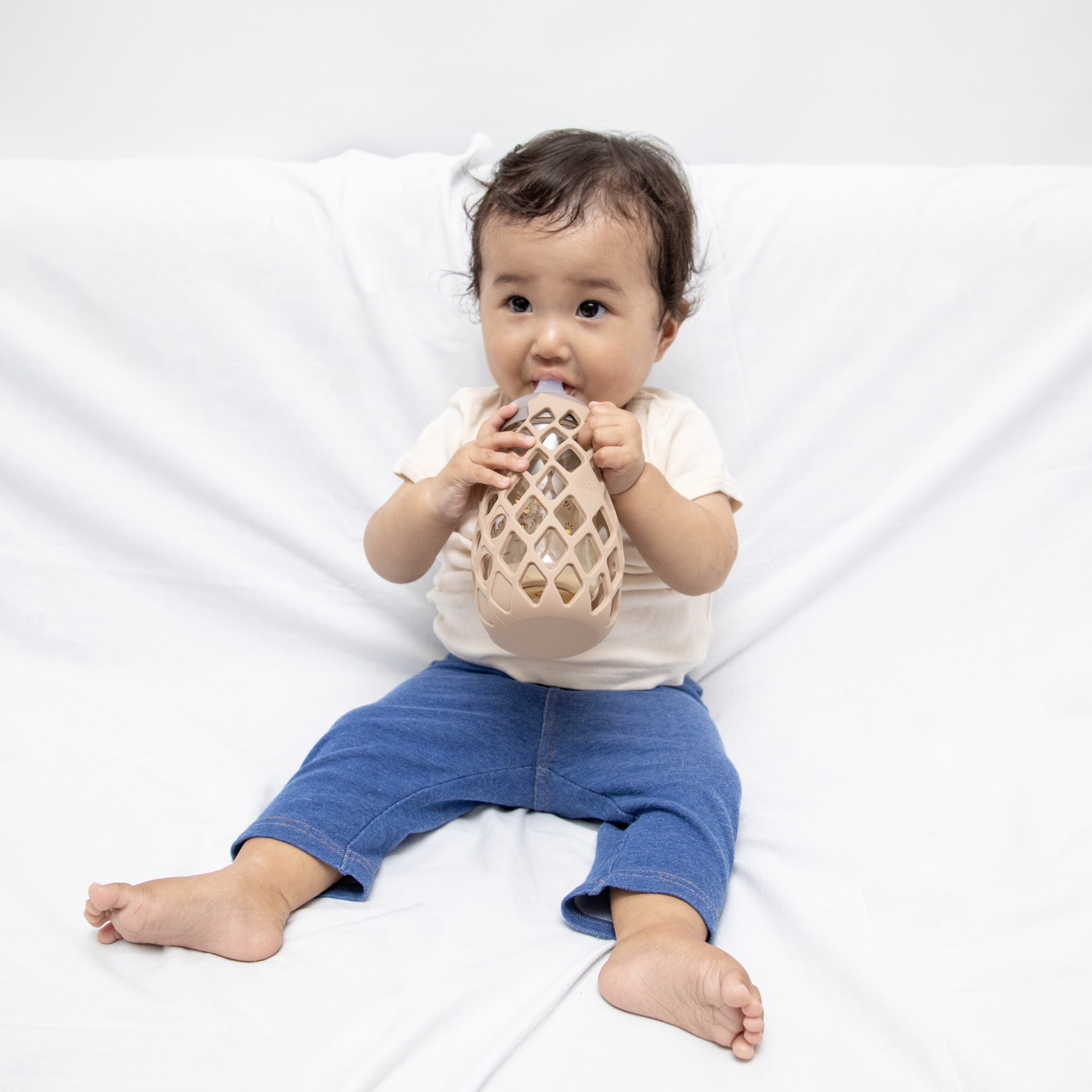 小さな手でもしっかりつかめる哺乳瓶ホルダー。