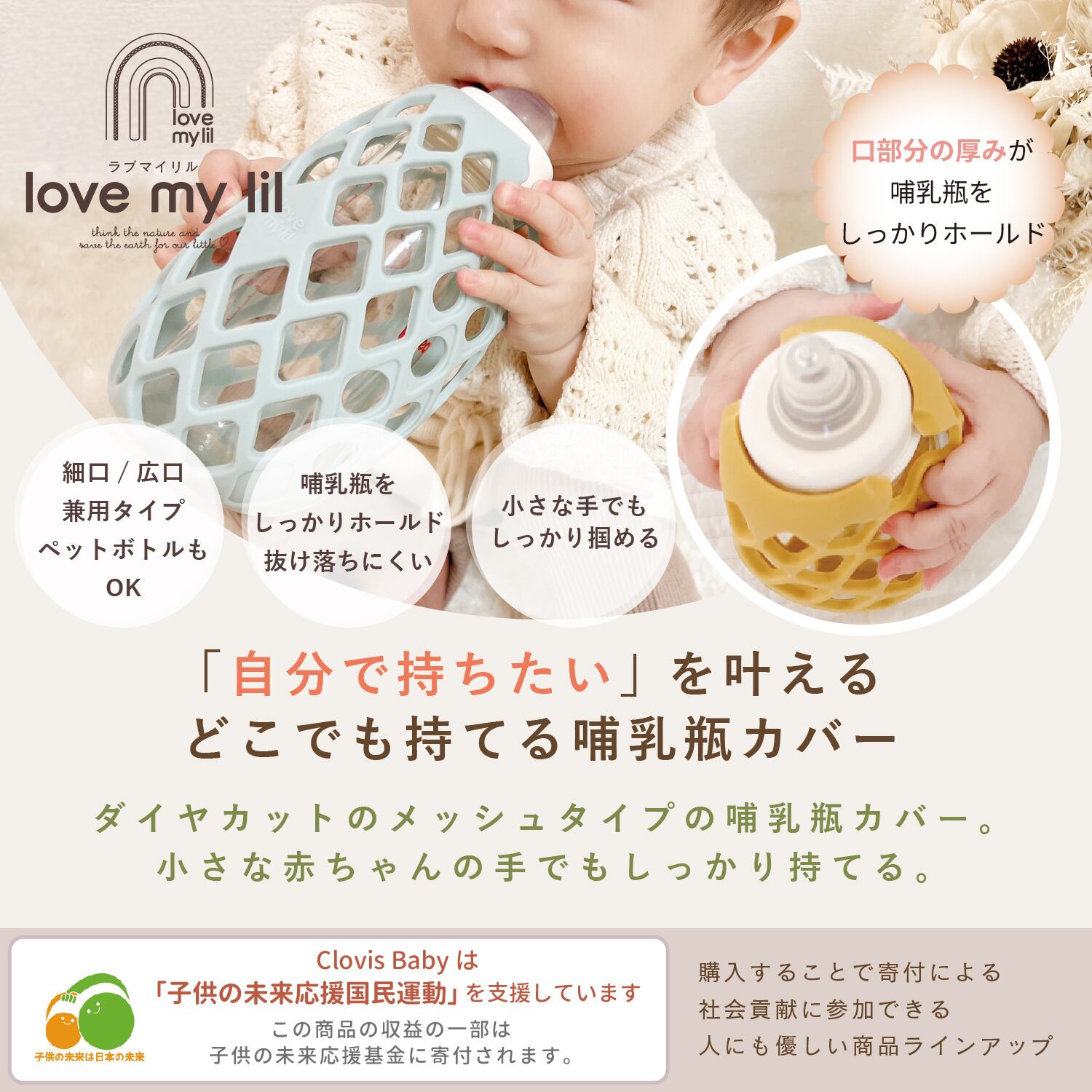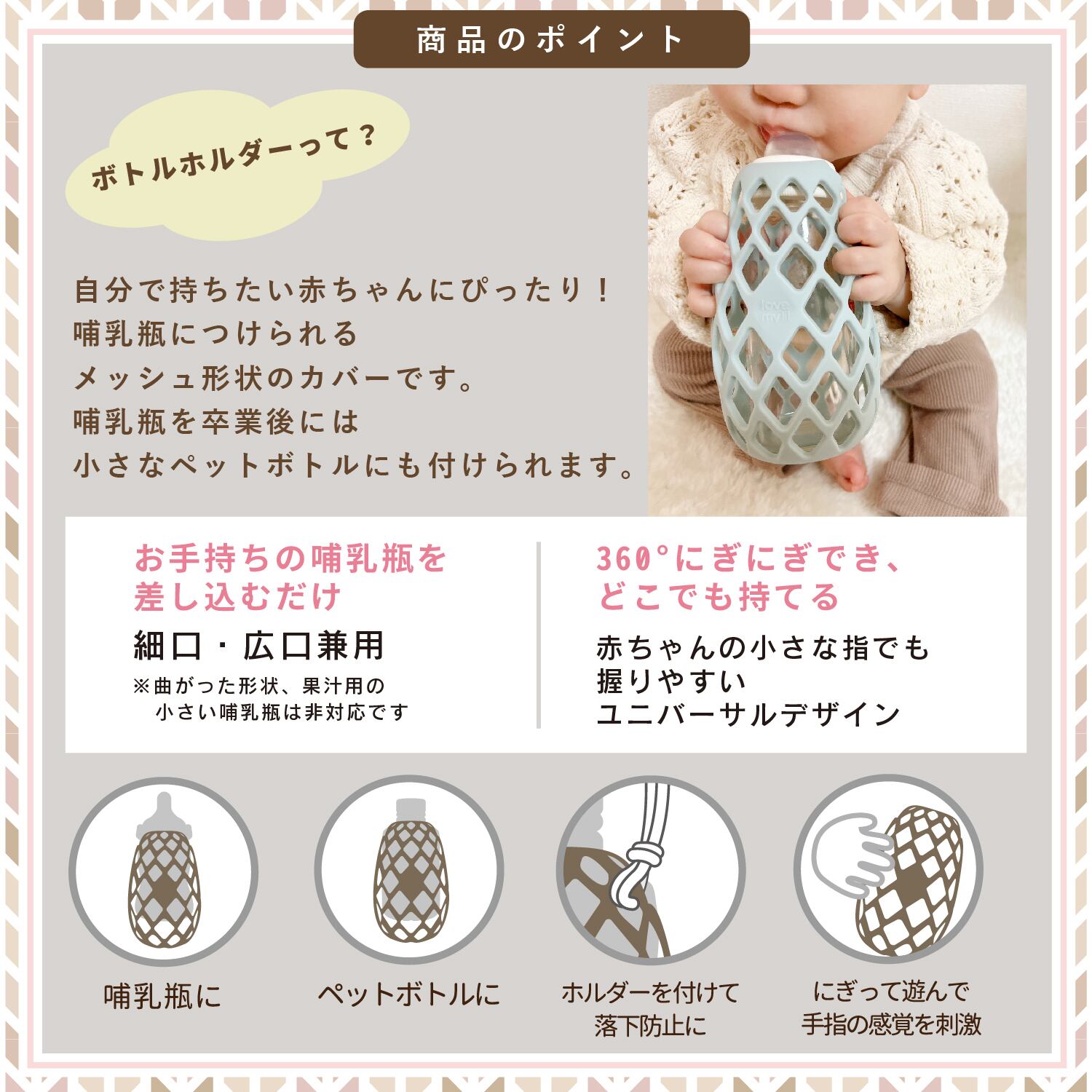 小さな手でもしっかりつかめる哺乳瓶ホルダー。