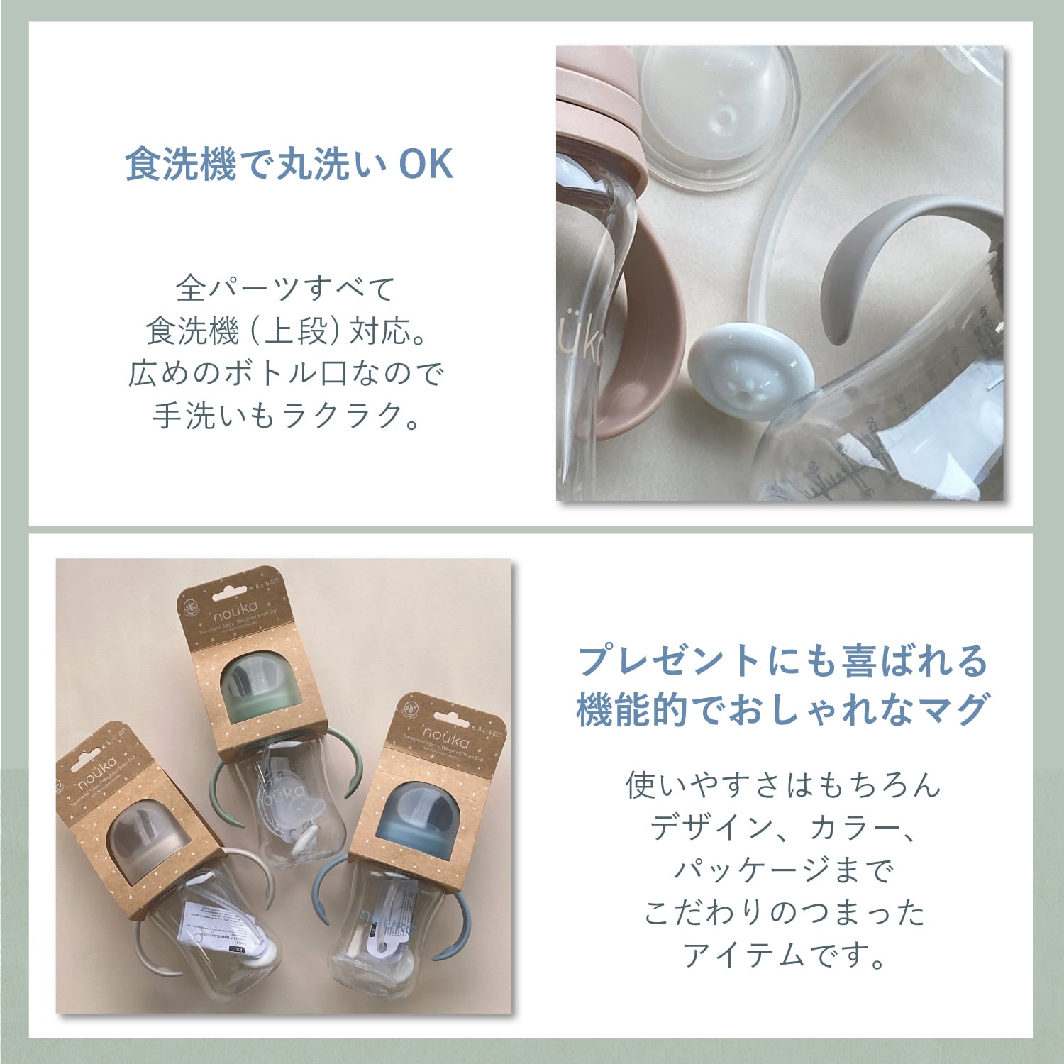 シンプルで洗練されたデザインのマグは、成長をやさしくサポートしながら、おうちでも外出先でも活躍する実用性が魅力です。忙しい育児の中に、少しの余裕と楽しさを。
