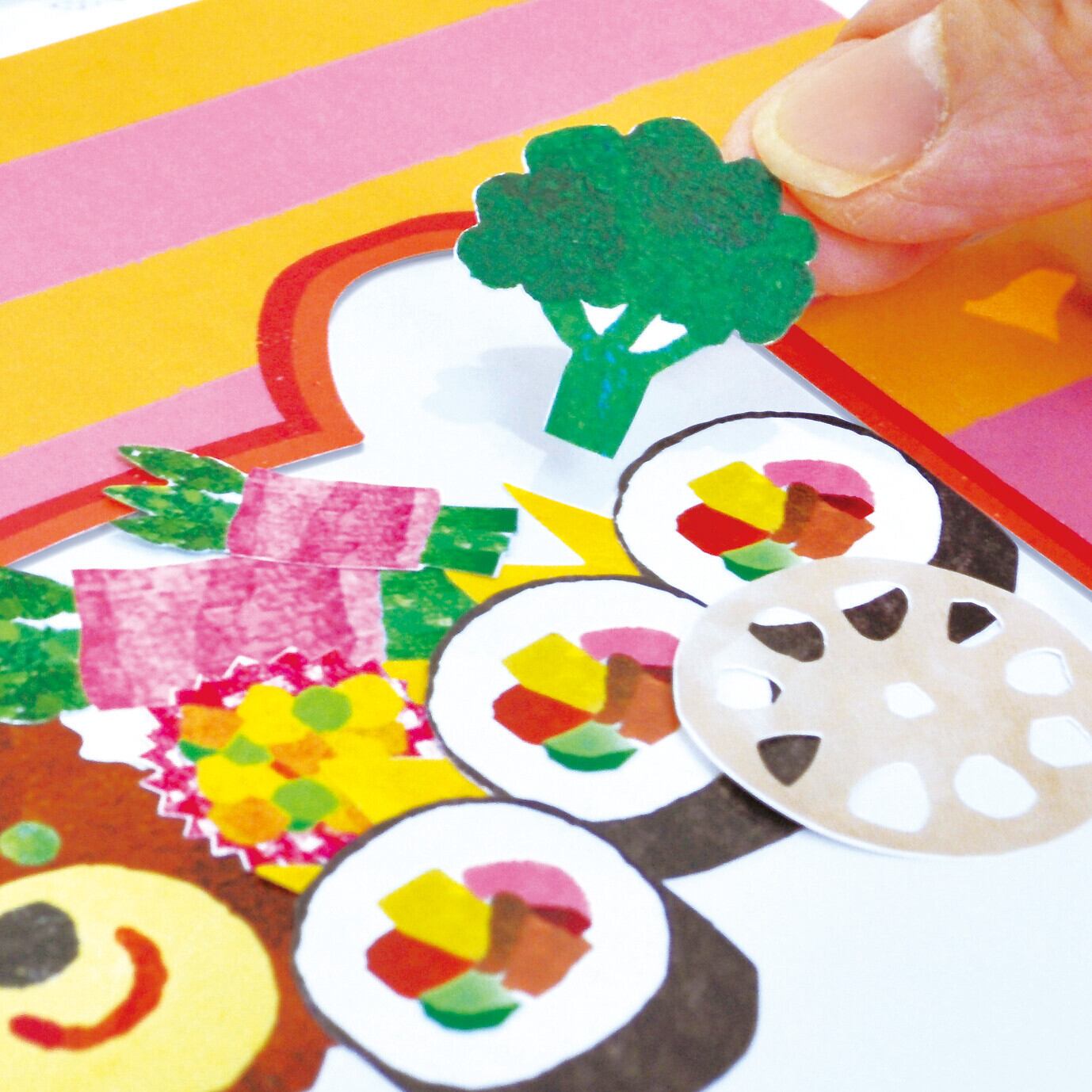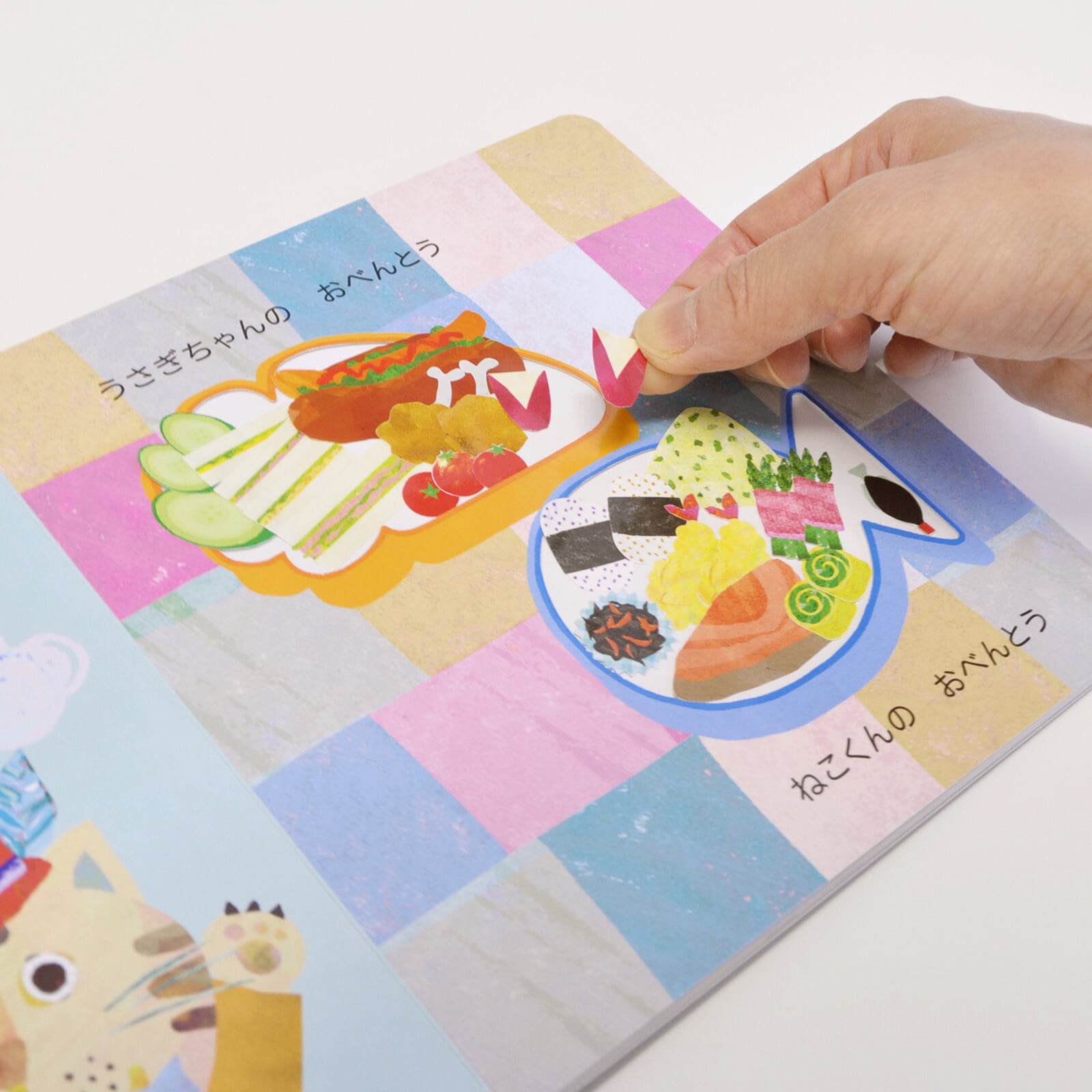 シールのおかずを貼っておべんとうをつくるボートブックです。