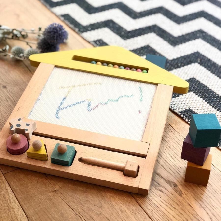 黄色い三角屋根にはカラフルなビーズが10個ついているので、数遊びもして頂けます。