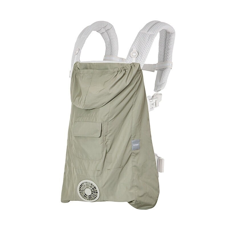 ベビーケープに付いた小型ファンで、ケープの中に外気を取り入れ、体の表面に大量の風を流すことにより、汗を気化させます。