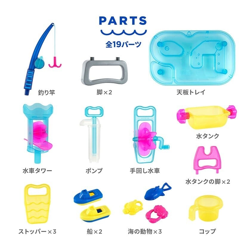 ストッパーで水の流れを変えて、手回し水車 で船を動かしたり、釣り竿でお魚つりも。