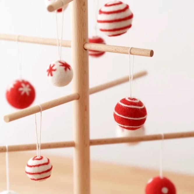 ネパールで手作りのやさしいフェルト玉のオーナメントとかわいいフェルトのブーツ(赤バージョンは赤ブーツ・グレーバージョンは白ブーツ)のオーナメントも付属しています。