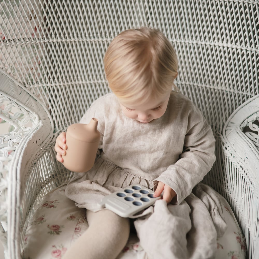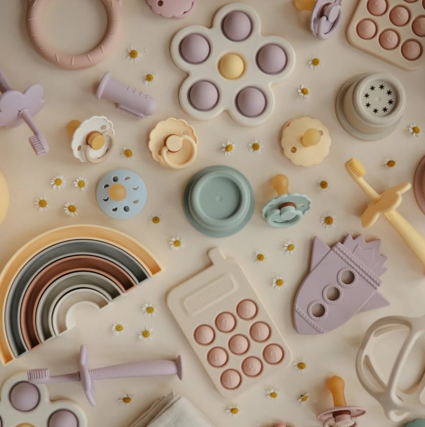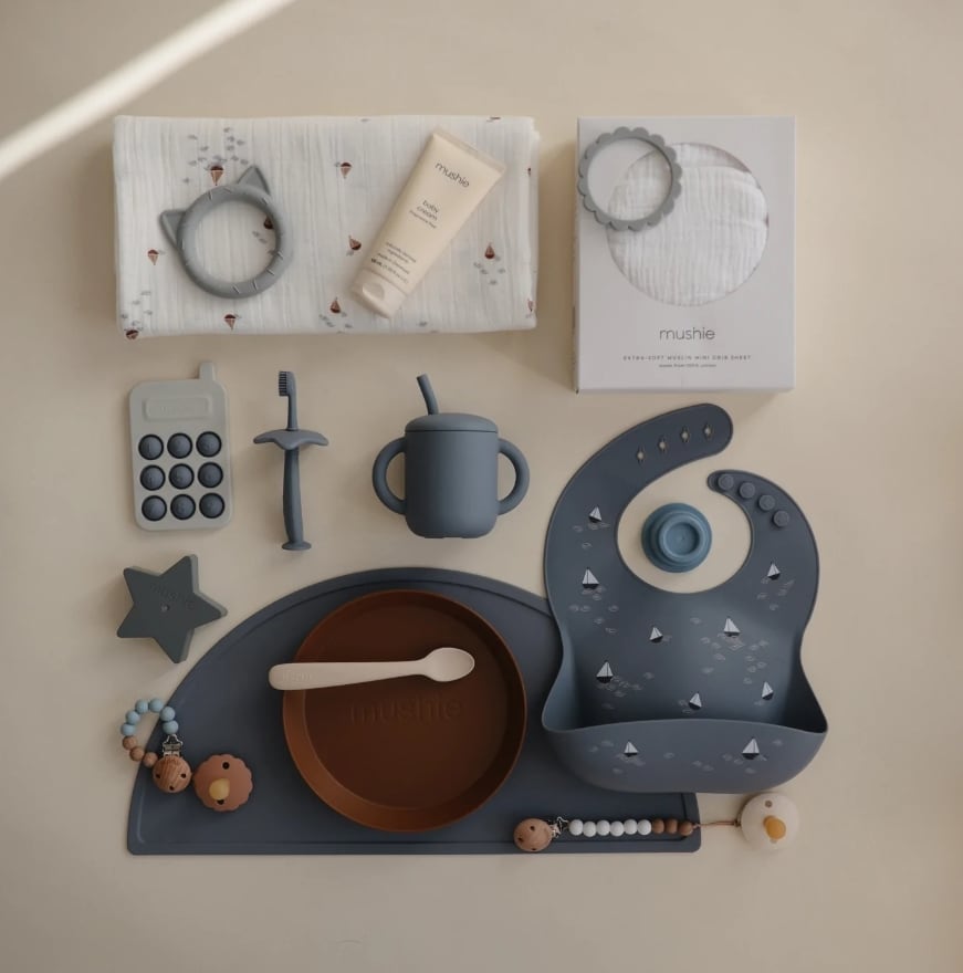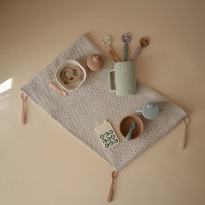 ビブやテーブルウェアは、どれもインテリアに馴染むくすみカラーがかわいい北欧風デザイン。