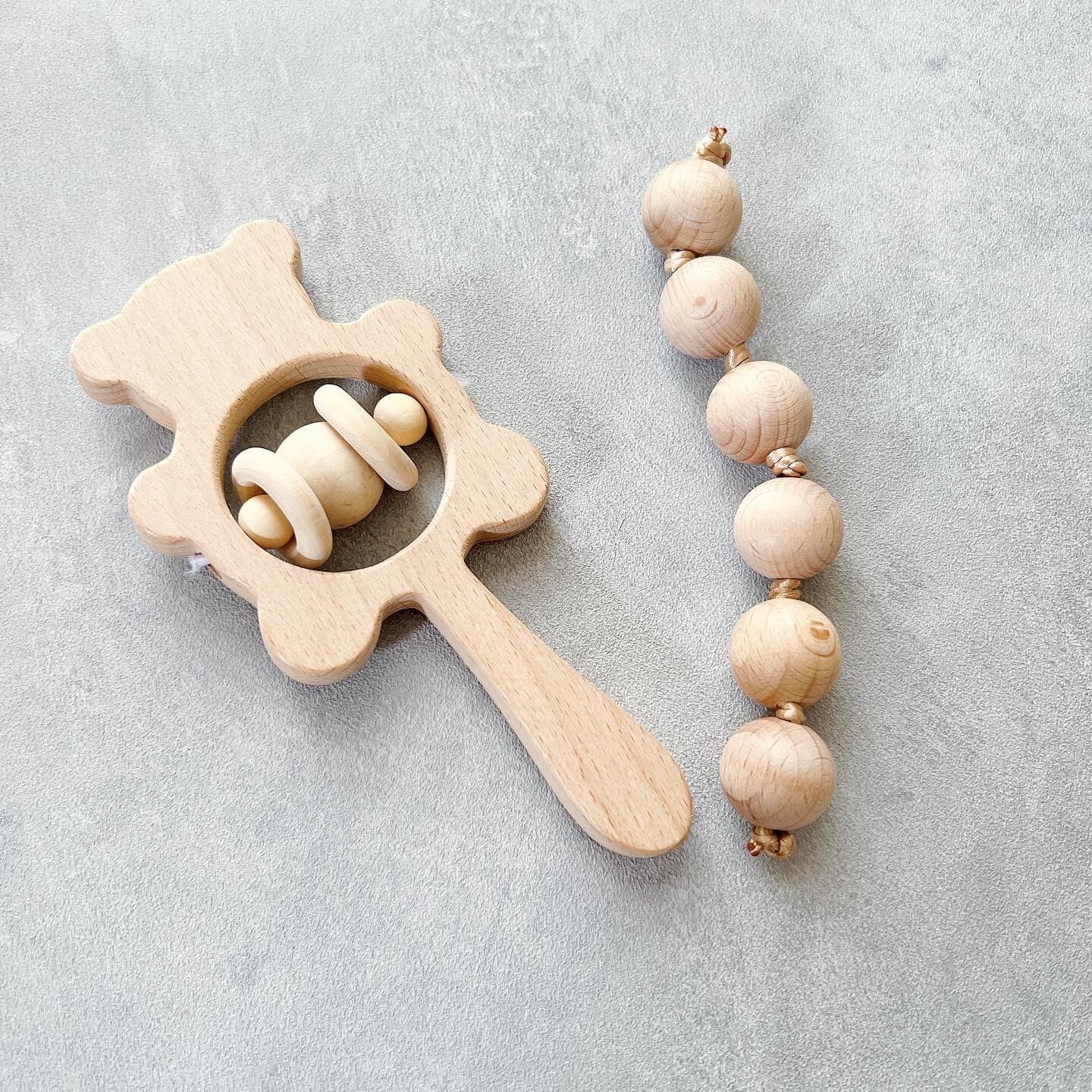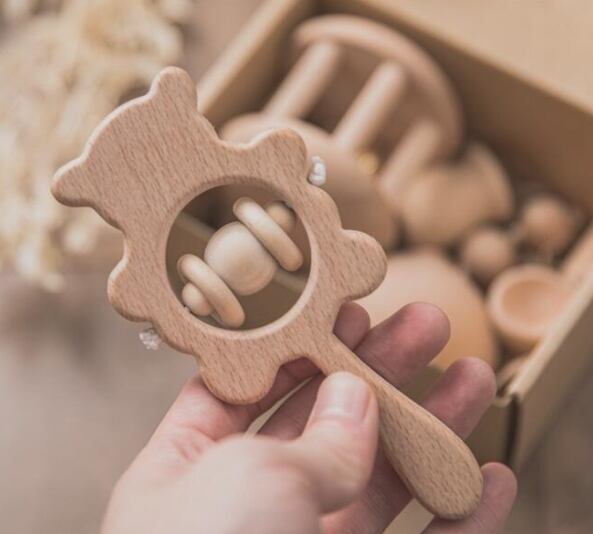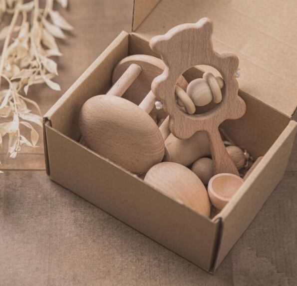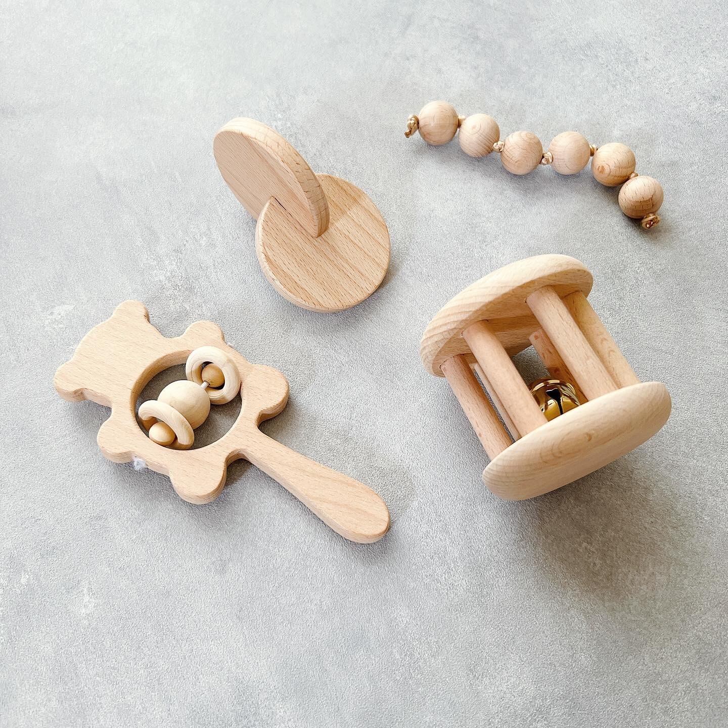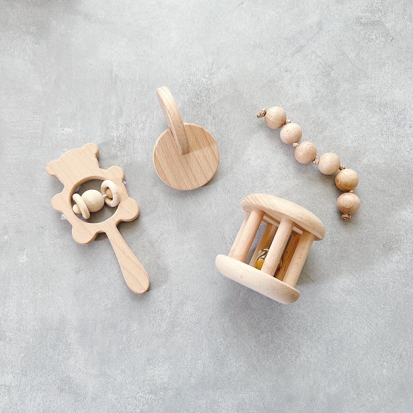 赤ちゃんに安心の天然素材の木のおもちゃセット。
