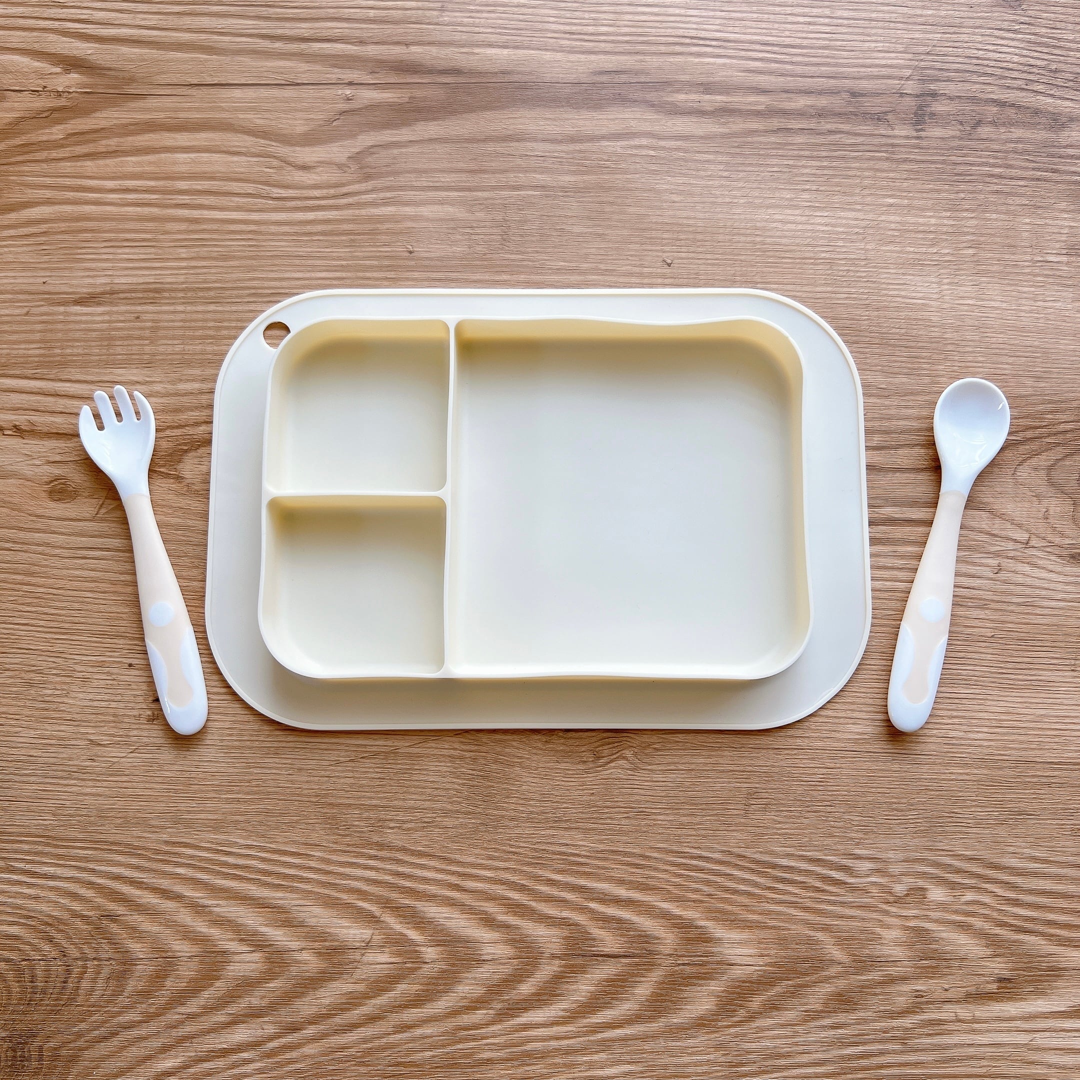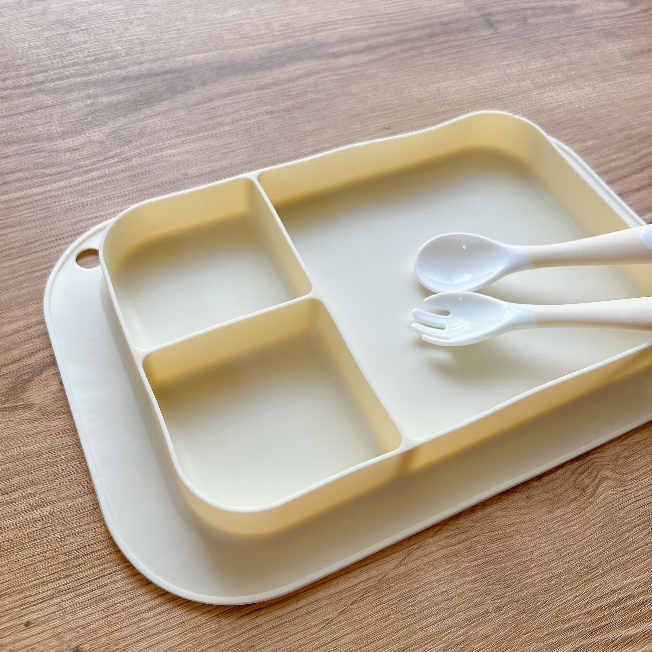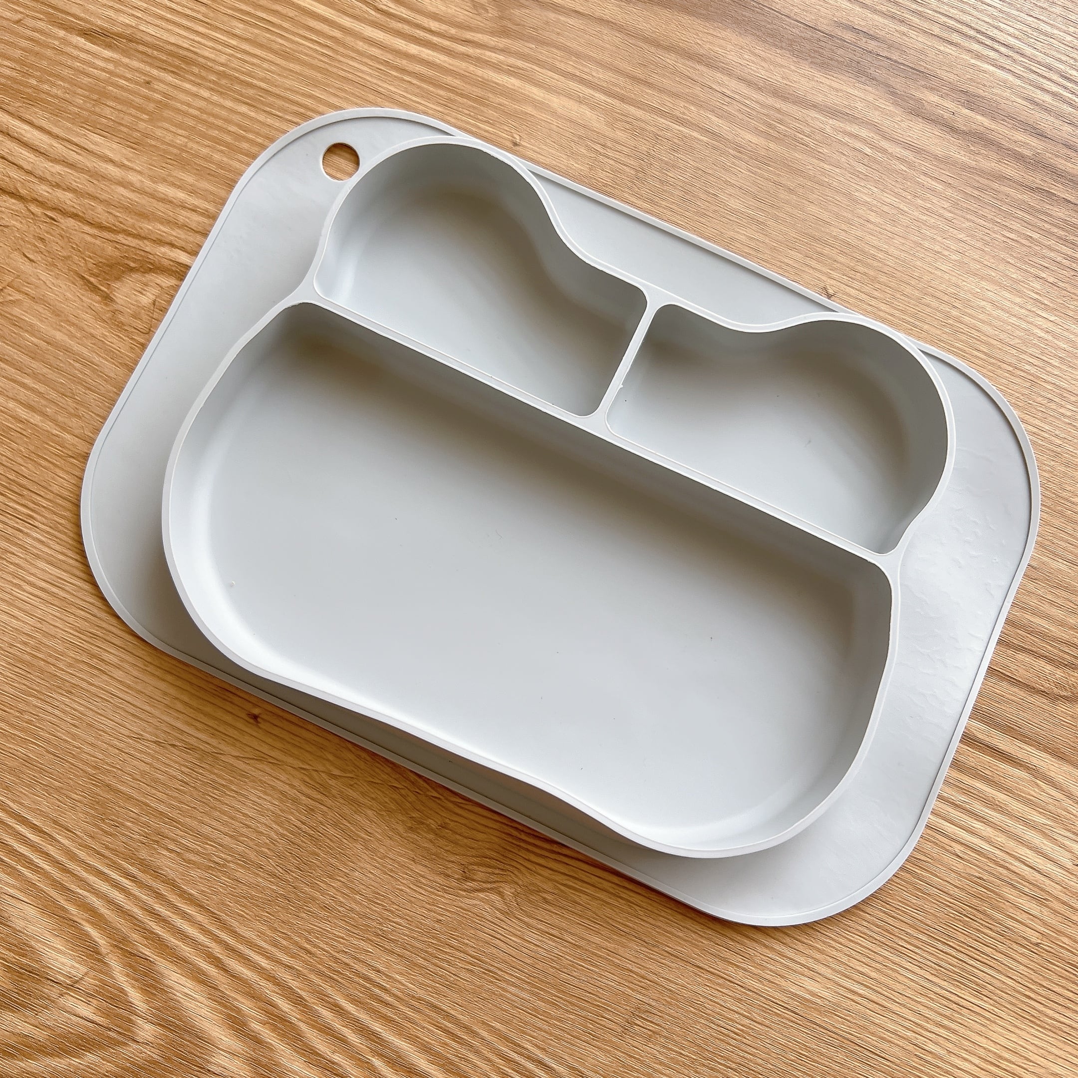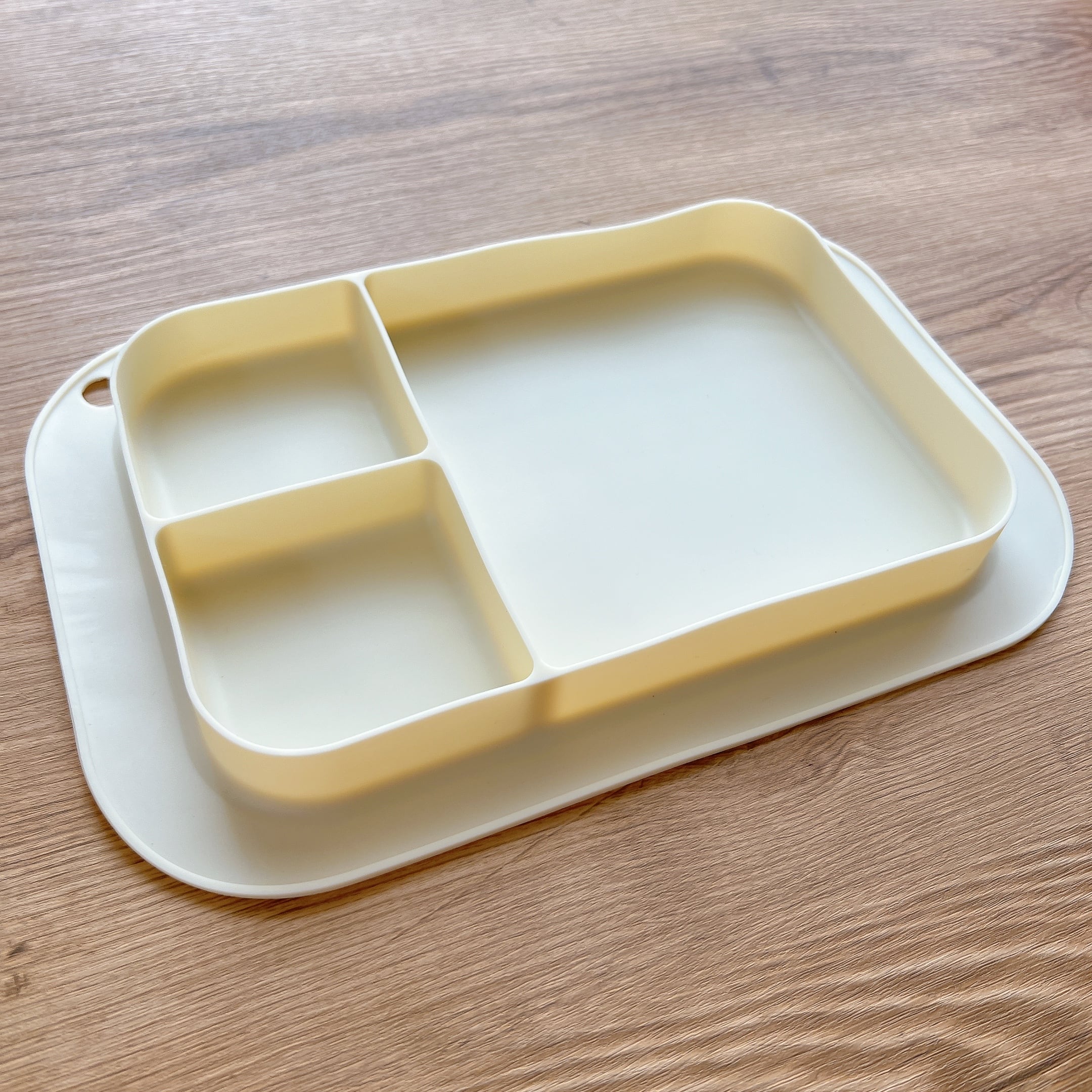シリコン製プレートは、仕切り付きだから水分の多いものやデザートなど分けて入れられます。