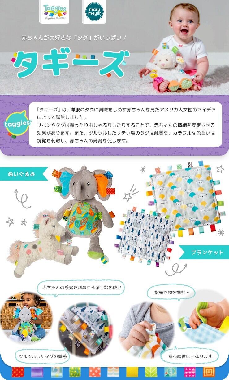 「タギーズ」は、自分の赤ちゃんが洋服のタグに興味津々な姿を見たアメリカ人の母親のアイデアによって誕生しました。