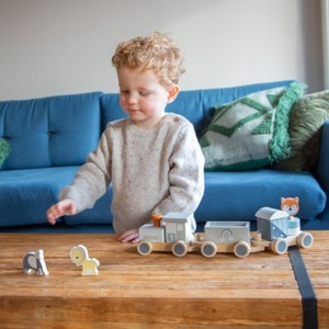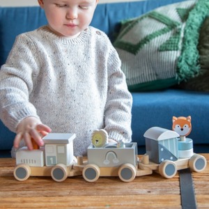 いろいろな形の積み木と、かわいい動物の電車セット。