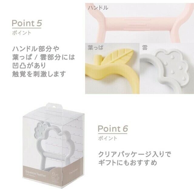やわらかなシリコーン素材なので、にぎにぎ遊ぶおもちゃとしても使えます。 ハンドル部分や葉っぱ部分には凹凸があります。
