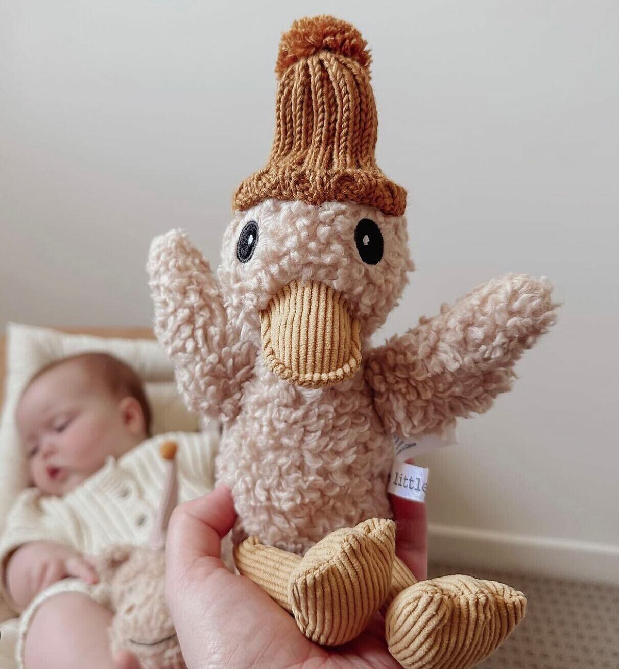 ユニークなコットンプラッシュ生地で作られたペチュニアダックのぬいぐるみです。